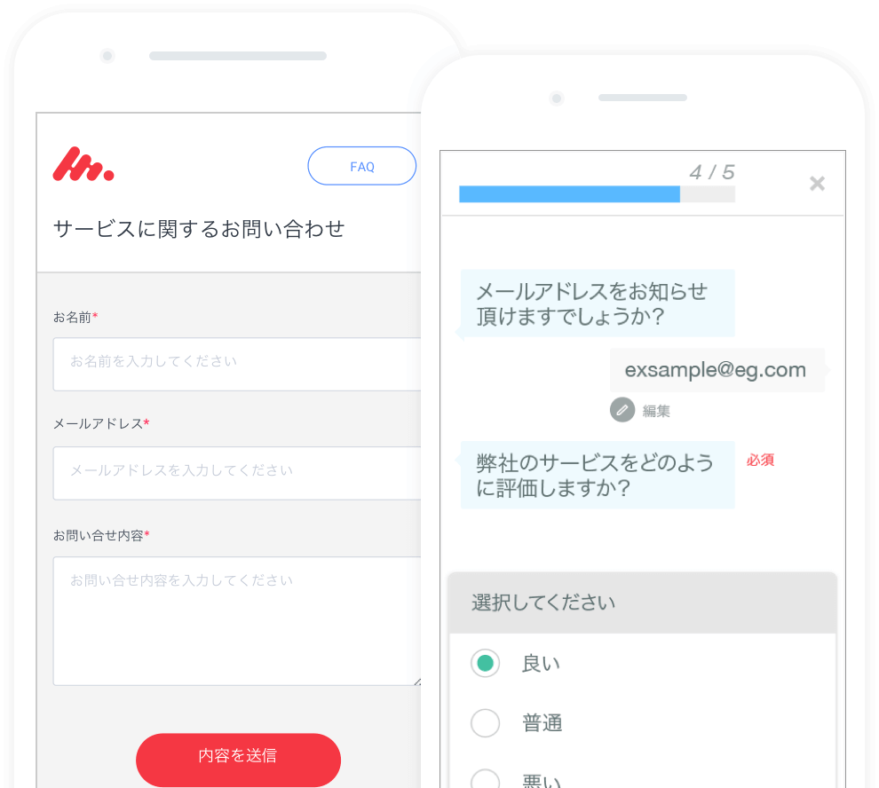 また、LINEのようなメッセージアプリのように、1問1答形式で回答してもらう「チャット形式」のUIも利用可能。スマホからのアンケート回収率を大きく改善できるように意識したデザインになっています。